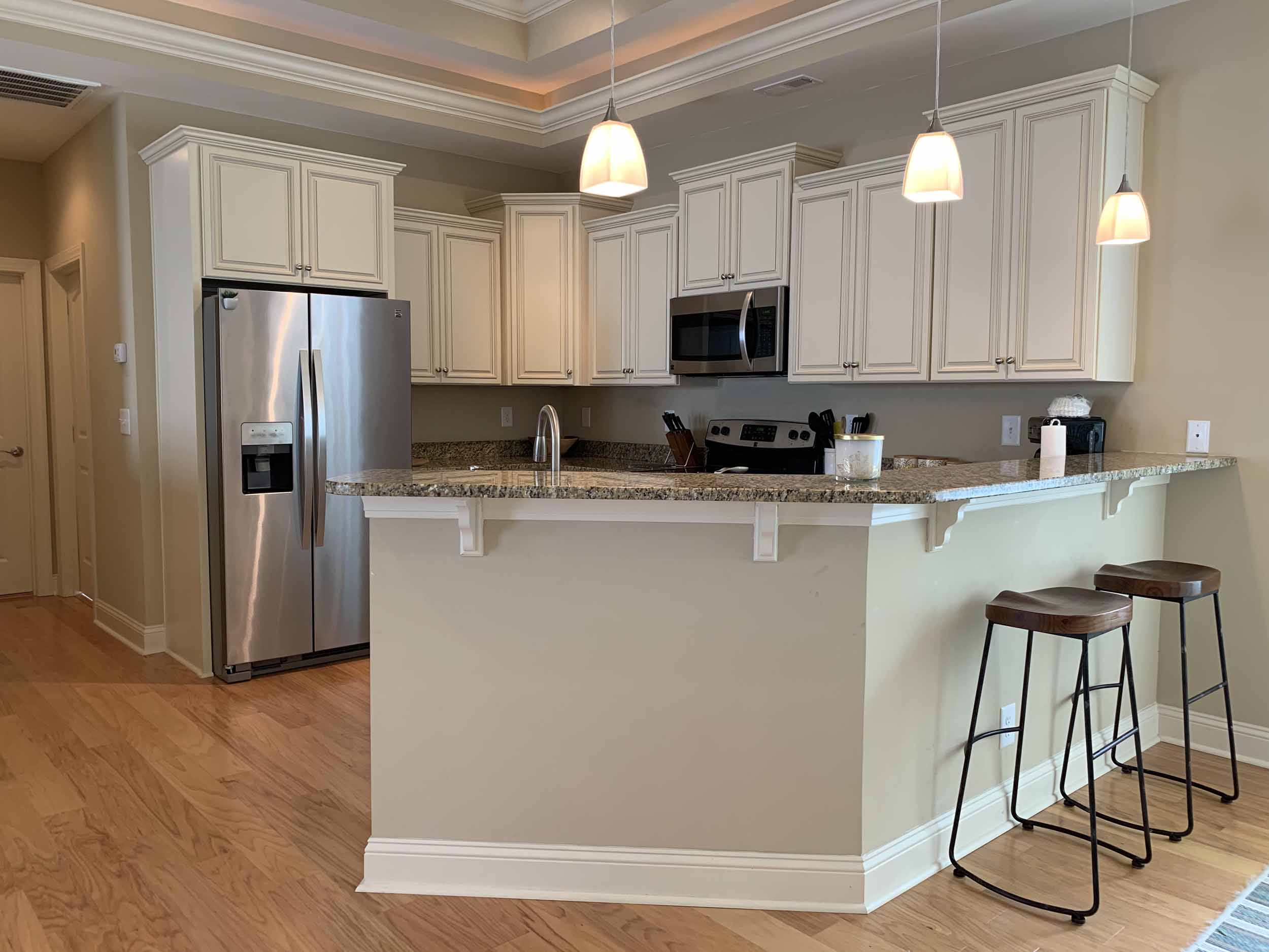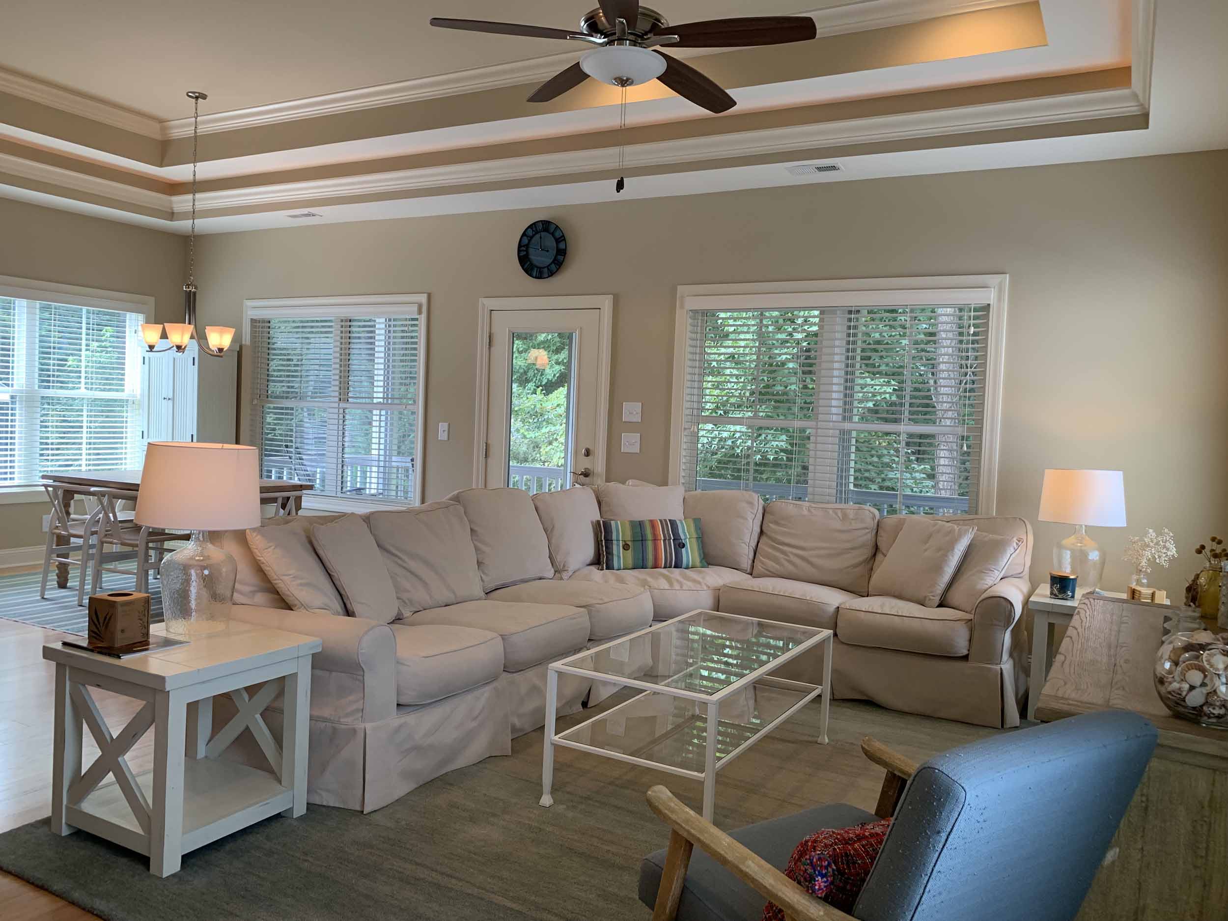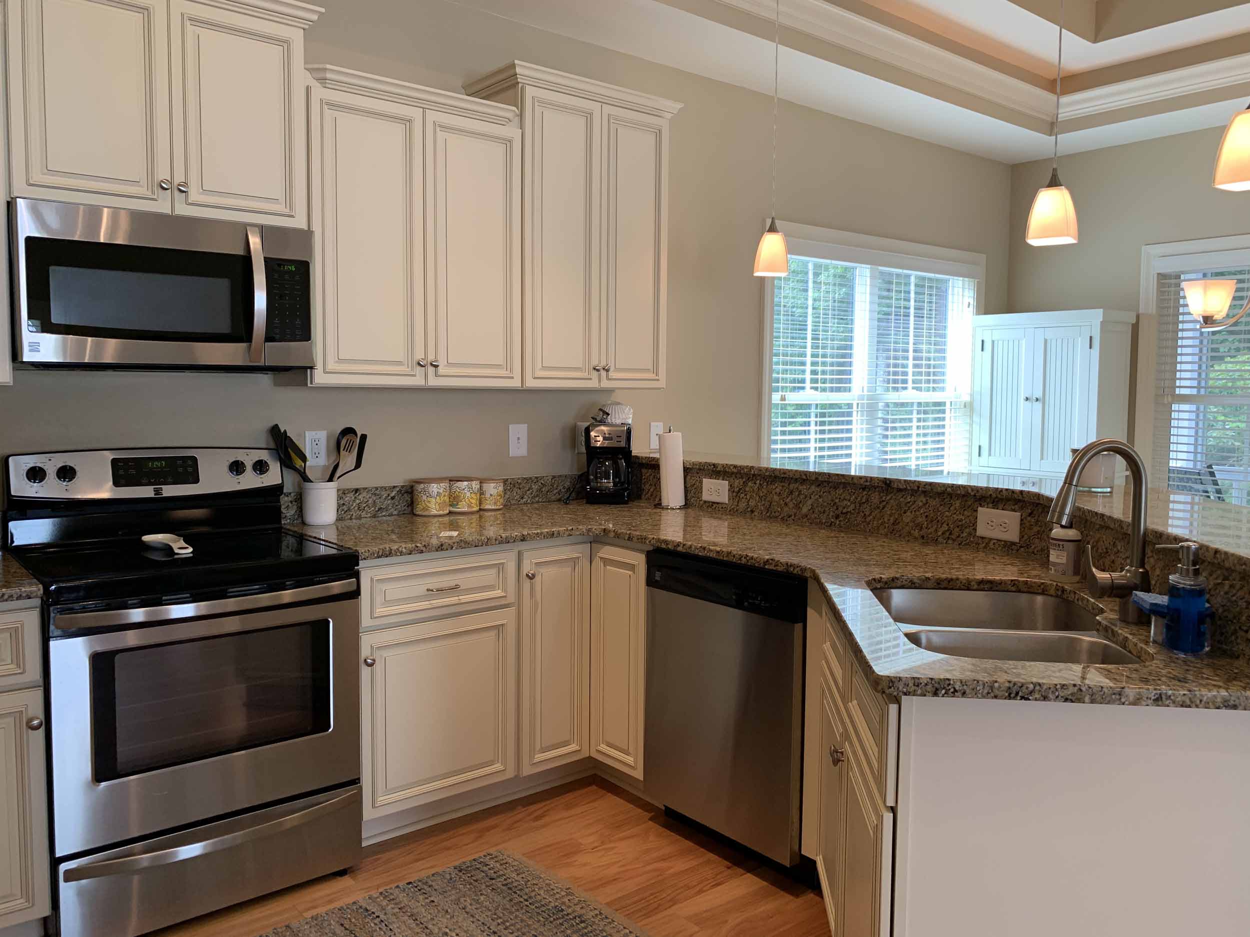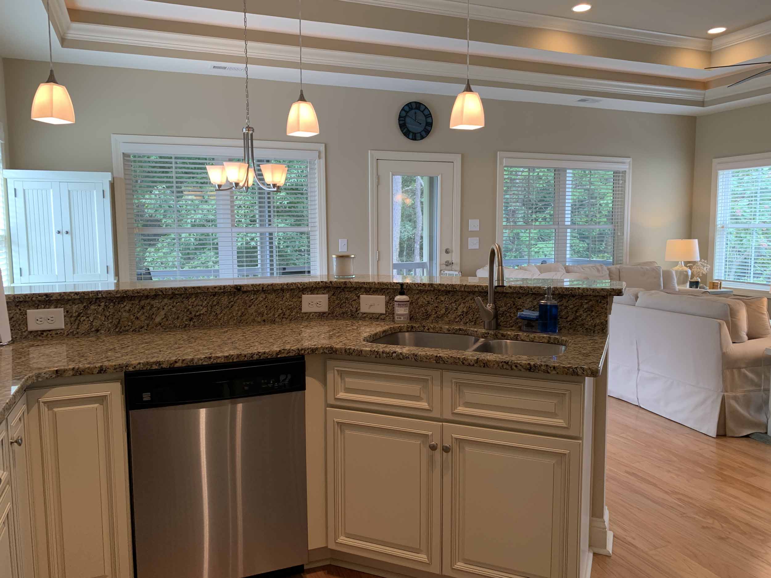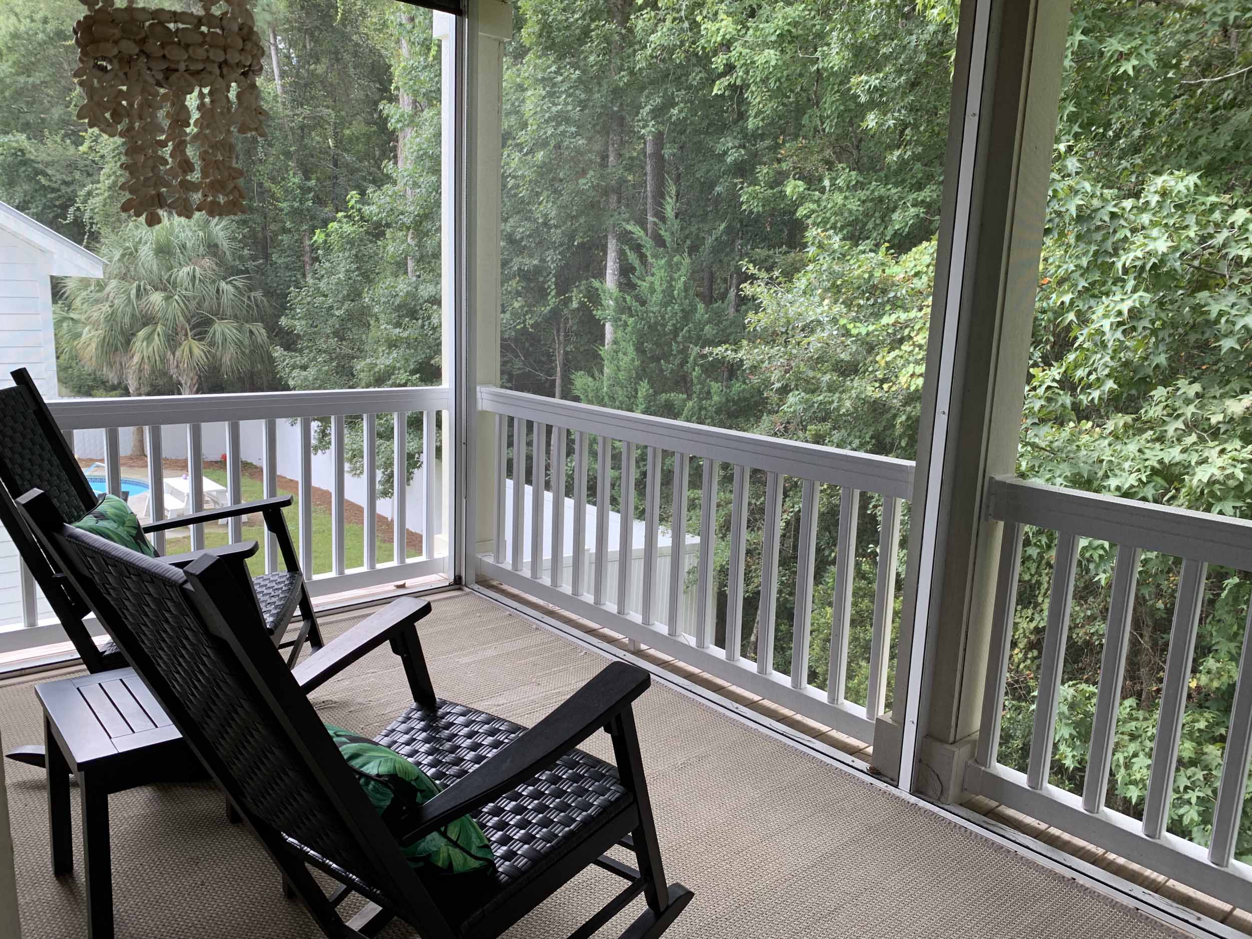 Pawleys Pointe - East of Ocean Hwy. in the heart of Pawleys Island. This home is so amazing, and beautifully furnished, too! Spacious floor plan. Lots of windows for natural light. Living, dining, kitchen, half-bath, master suite, screened porch and laundry room are on the main floor. Two bedrooms are on the lower level. Incredible cove ceiling with indirect and cove lighting in living area and master suite. Open plan living, dining and kitchen. Living area opens to screened porch and wooded view. Kitchen with granite countertops, stainless appliances, breakfast bar. The large master suite has a queen bed, TV, and the master bath has granite countertop, double sinks, walk-in shower and an extra large walk-in closet. Downstairs features a beautiful foyer, 2 bedrooms (each with queen bed) and a bathroom with a tub/shower combination. There is a two-car garage, and a covered back porch. Once you walk into this home, you'll want to live here!  Pawleys Pointe amenities include a swimming pool.
